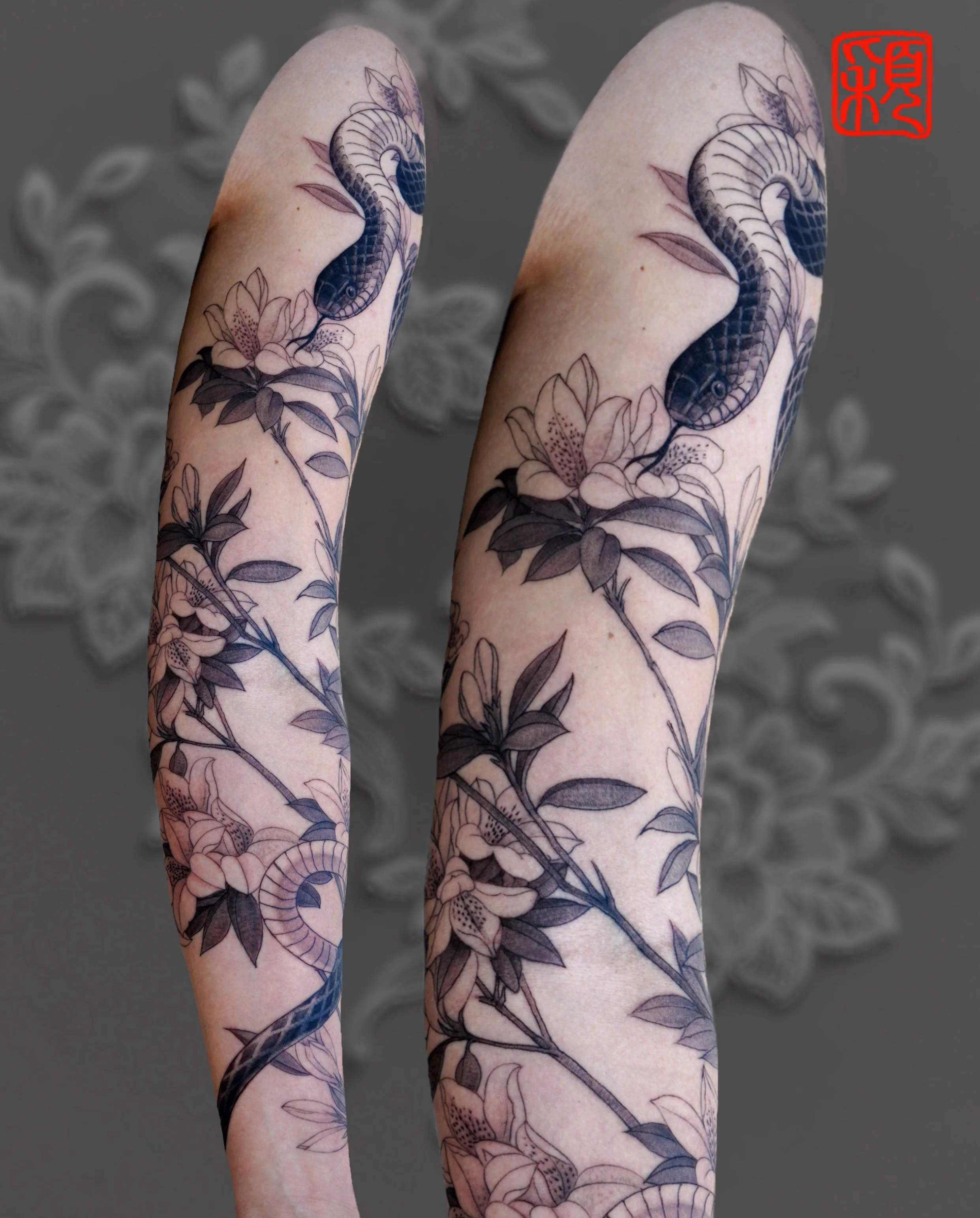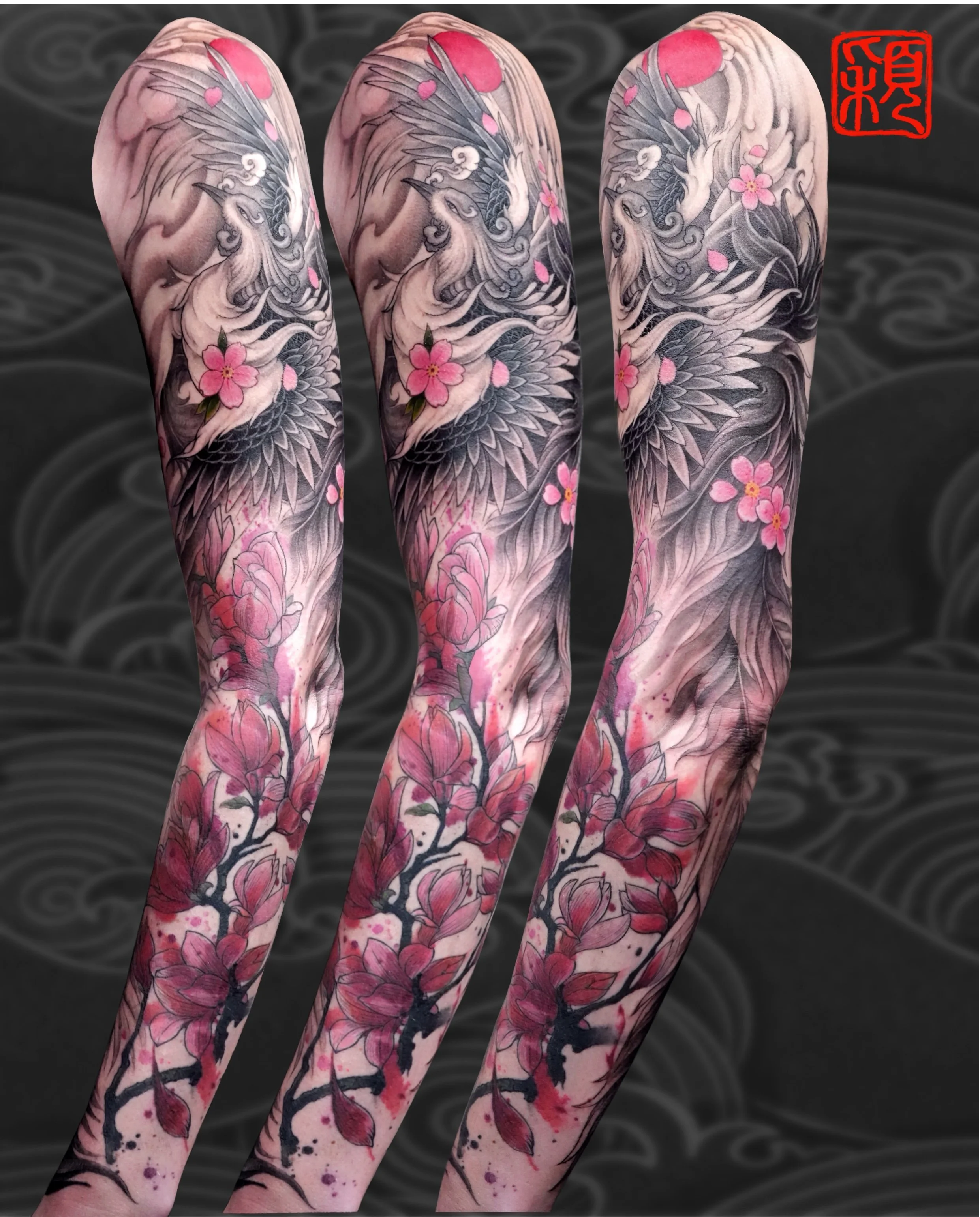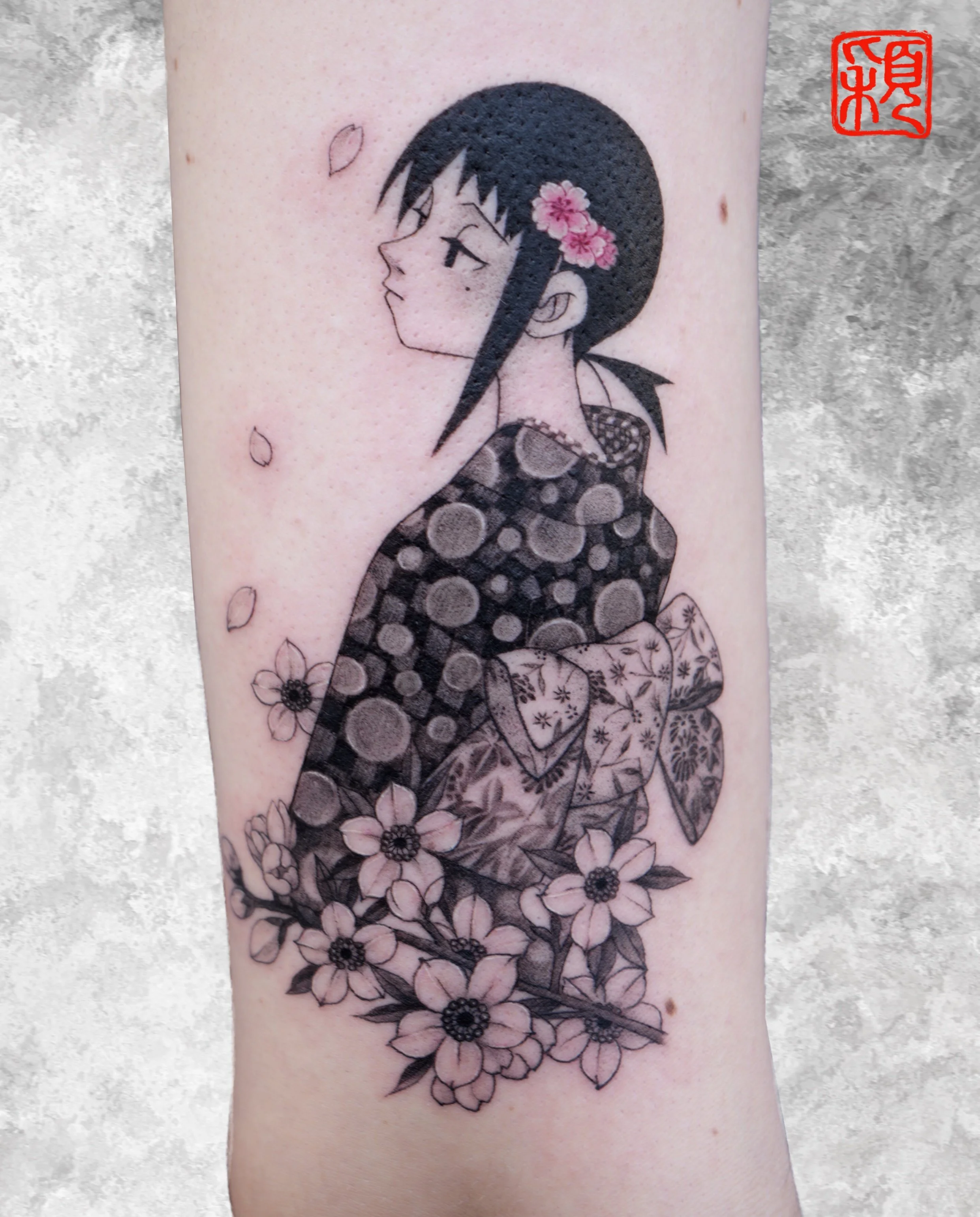 Through the ingenious combination of traditional techniques and tattoo painting, she formed her own beautiful and delicate Kyo tattoo style. Her art adheres to the original form of traditional painting, but is also infused with the perfect combination of modern tattoo art.