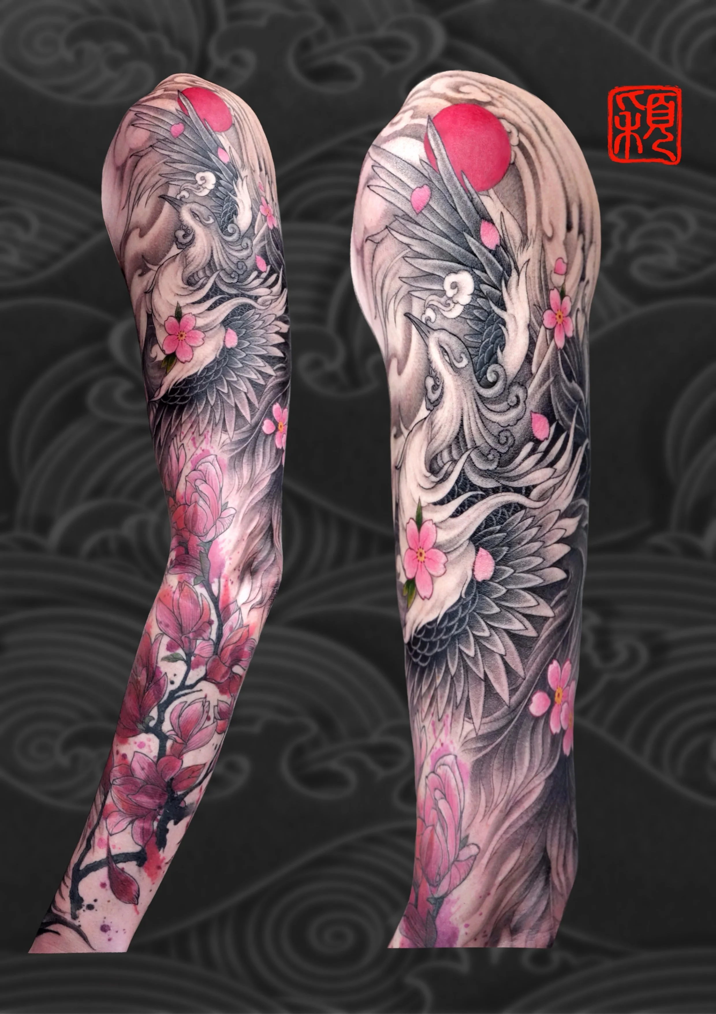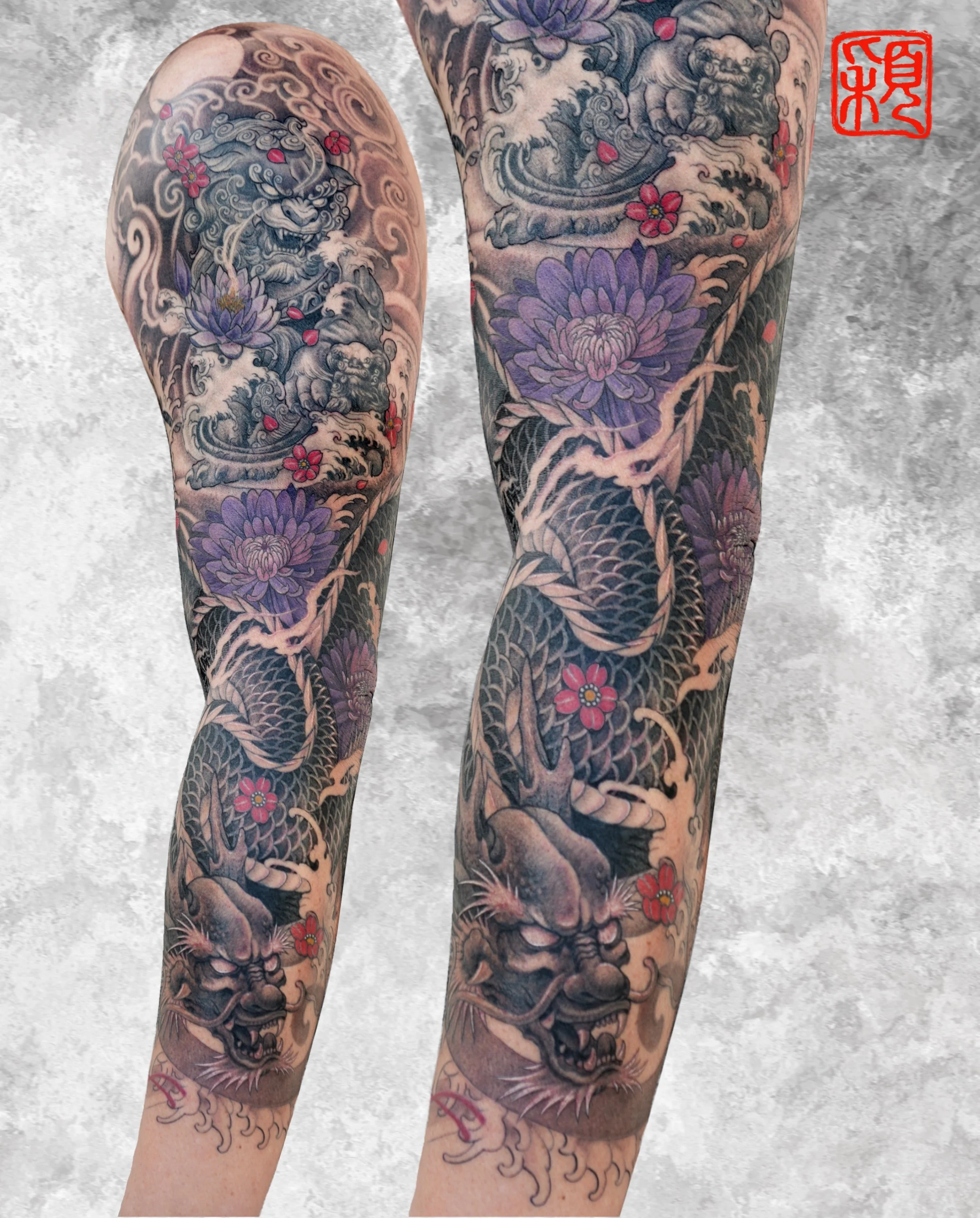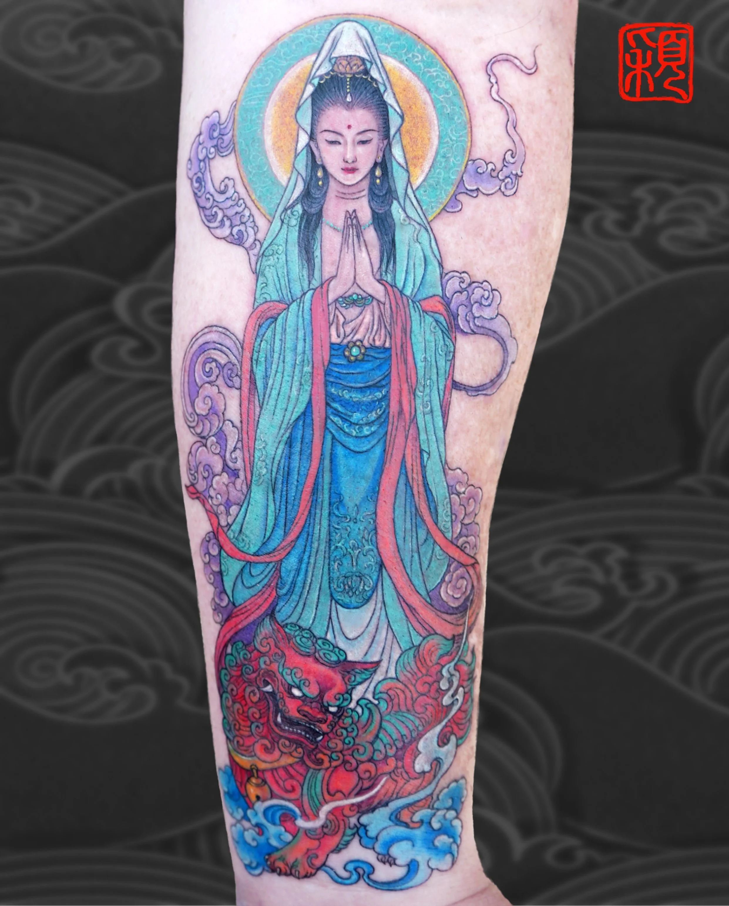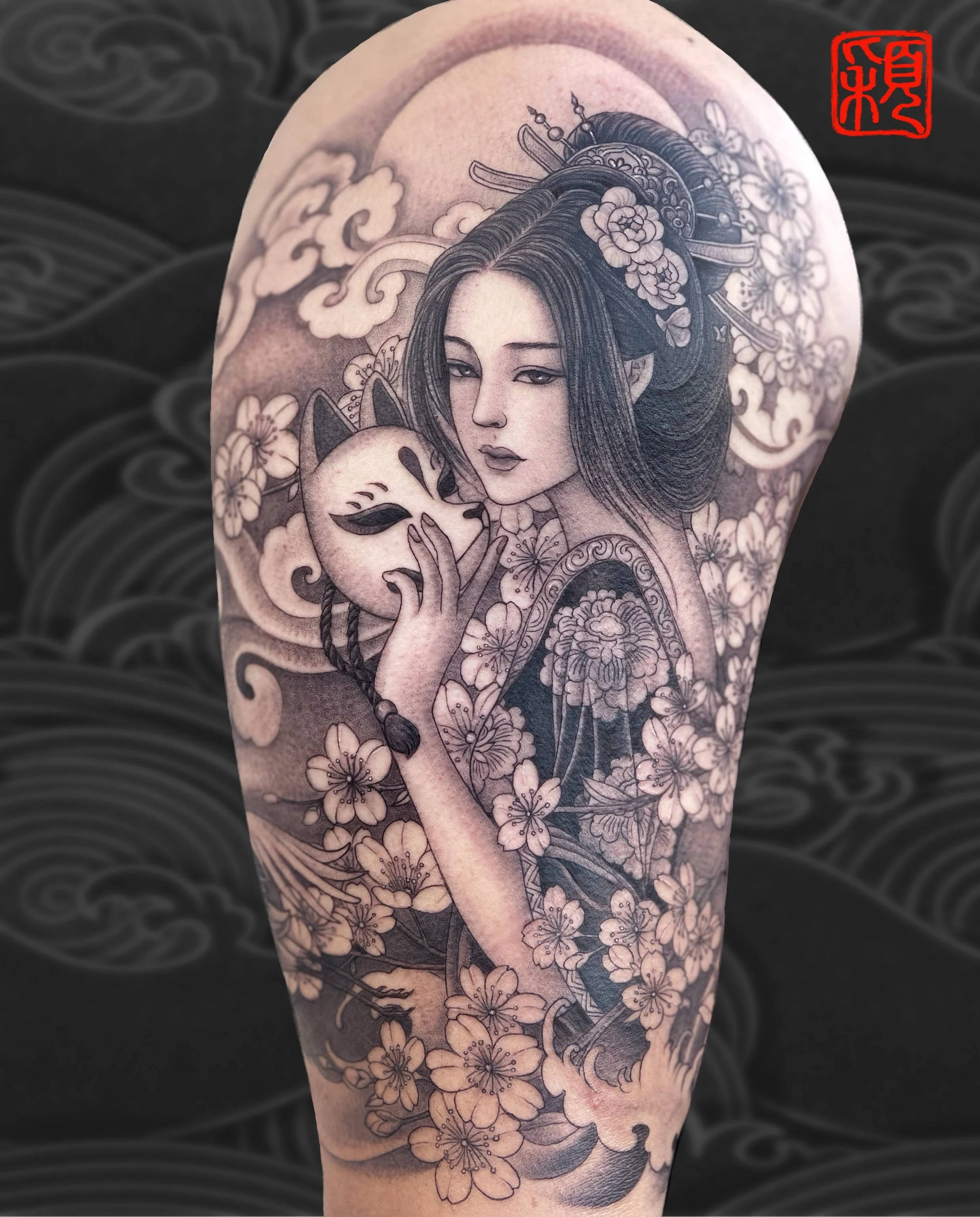 Through the ingenious combination of traditional techniques and tattoo painting, she formed her own beautiful and delicate Kyo tattoo style. Her art adheres to the original form of traditional painting, but is also infused with the perfect combination of modern tattoo art.